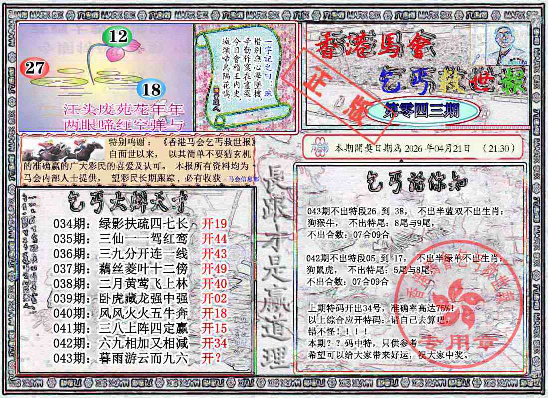 1760 大富翁 1761 侨乡狂扫黑庄 1765 马经王牌料 1766 香港马会专刊A